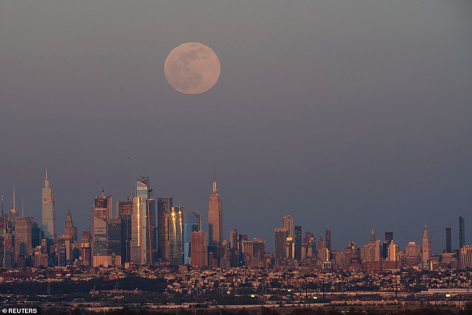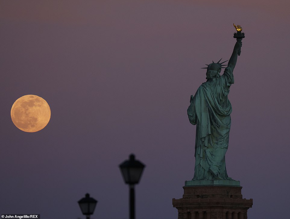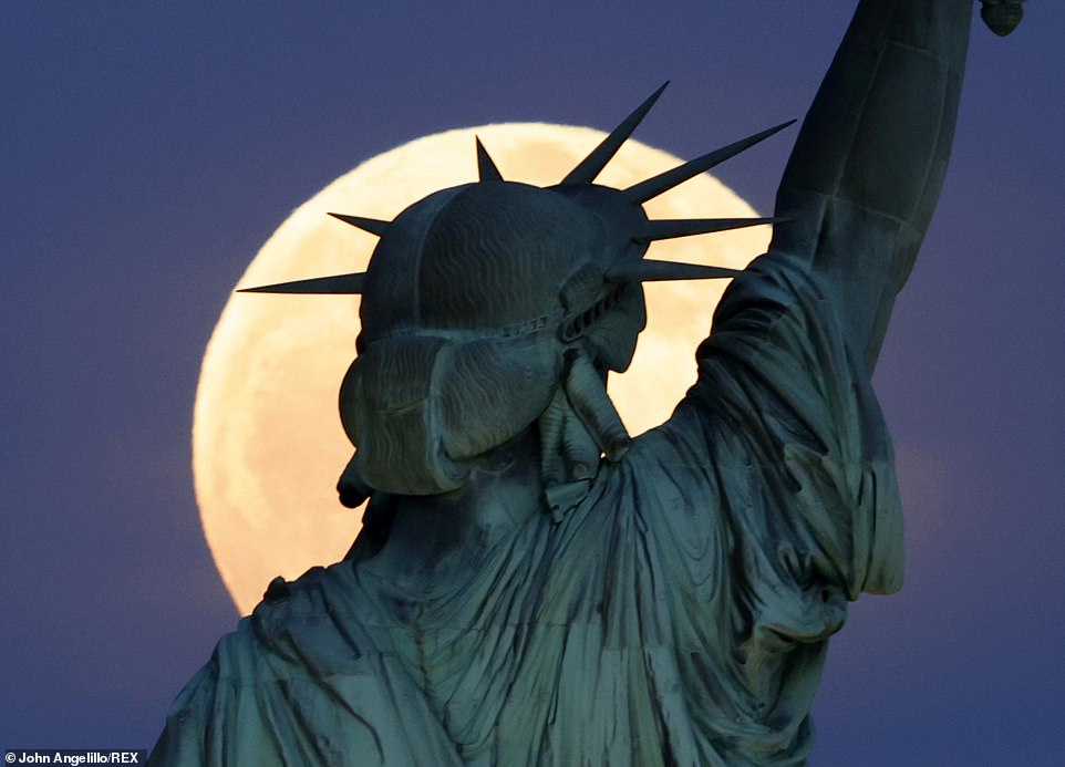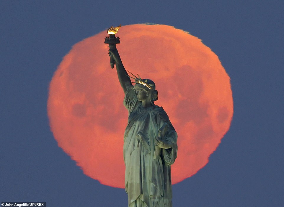 2021年05月01日罕見的「超級粉紅月亮」於4月27日晚登場。這一夜的滿月很特別,比普通的滿月大14%,亮約30%。有網友拍到「超級粉紅月亮」與「自由女神像」交相輝映的畫面,滿月散發著柔和的金色光芒,將夜空點綴得更加夢幻~