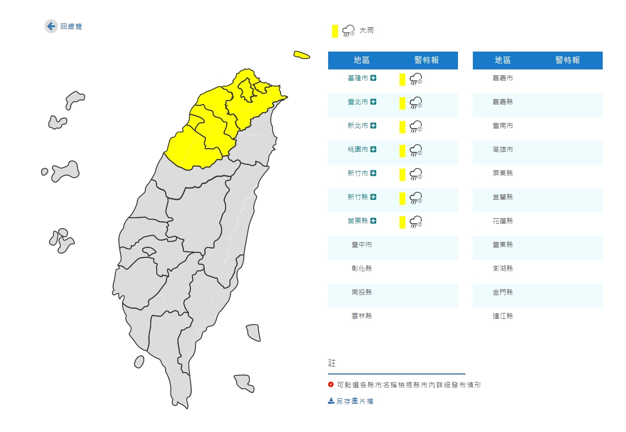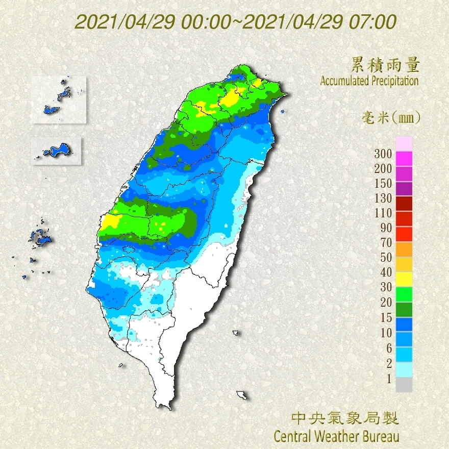 2021年04月29日今天(29)白天鋒面通過,再加上東北風稍增強,苗栗以北至基隆地區有局部大雨發生的機率。氣象局對基隆市、台北市、新北市、桃園市、新竹市、新竹縣、苗栗縣等7縣市發布大雨特報。一些民眾表示,早上是被雨聲吵醒的,第一次覺得被雨聲吵醒是一件開心的事~