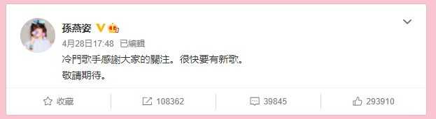 網友們看到後紛紛表示:「妳如果是冷門歌手那就沒有熱門歌手啦」、「妳才不是冷門歌手!期待姐姐新歌、演唱會」、「冷門歌手太客氣了!不如順帶來個巡演吧」。期待新作品啊~