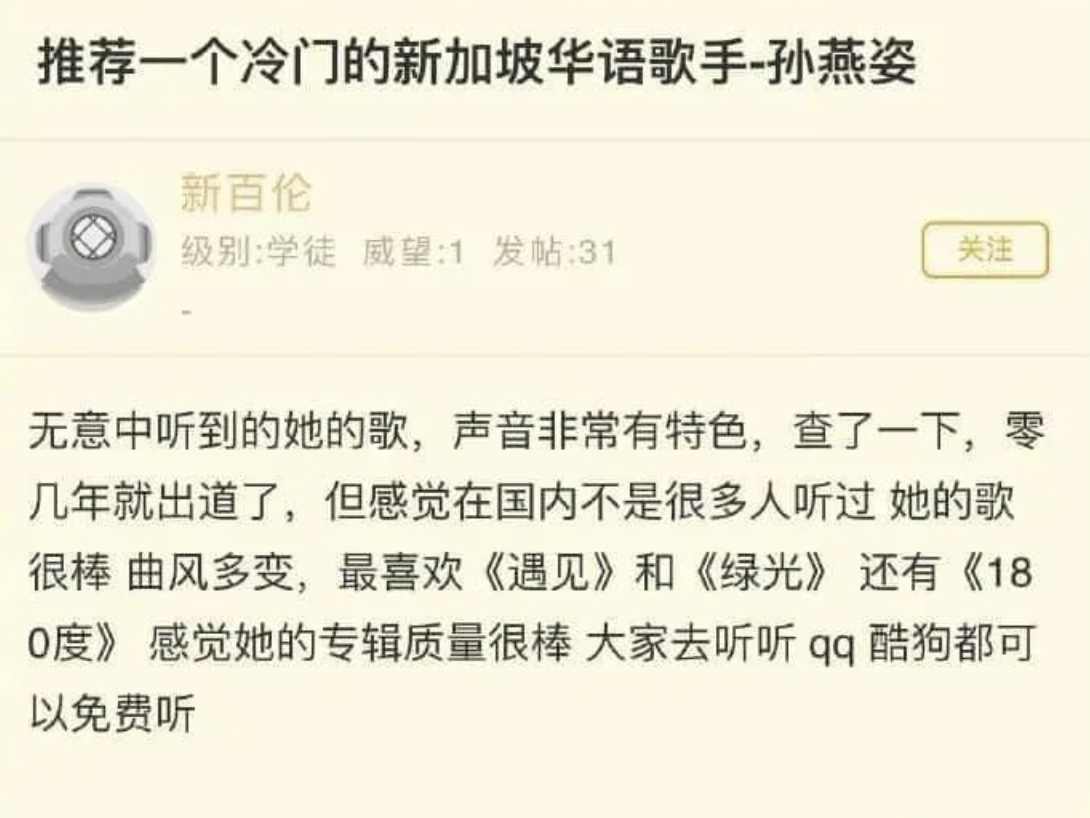 ▼大陸論壇上有一位網友以「推薦一個冷門新加坡華語歌手孫燕姿」為題發文,表示「無意中聽到她的歌,聲音非常有特色,零幾年就出道了,但感覺在國內不是很多人聽過她的歌,最喜歡《遇見》、《綠光》,感覺她的專輯品質很棒,大家去聽聽。」
