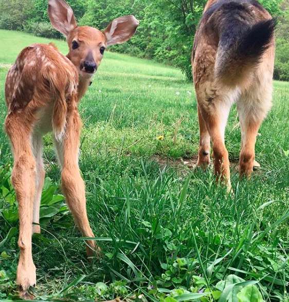 ▼小鹿蹣跚學步時,Sarge會在旁邊保護牠。每次小鹿自己跑出去玩,都是Sarge去找牠,並將牠平安帶回家。小鹿長大後被放歸野外,Sarge非常失落,但牠很快就忙碌起來,因為牠跟小鹿的故事在網路上流傳開來,Cheryl又帶回了其他需要照顧的小鹿。