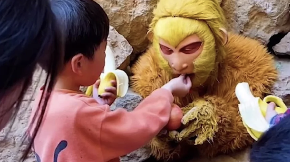 工作人員扮「孫悟空」壓五指山下 遊客狂餵香蕉崩潰:真的吃不下了!