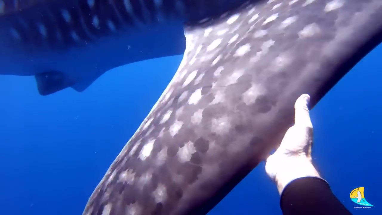▼套在鯨鯊身上的繩索非常結實,兩人努力切割了約10分鐘,才成功割開。他們立刻跟鯨鯊拉開距離,讓牠能自由游走。沒想到鯨鯊繞了一圈後,又游了回來。牠好像是來感謝Simon和Antonio的,Simon還伸出手跟牠的胸鰭一起「high five」擊掌。鯨鯊表達感謝後,才心滿意足地離開。