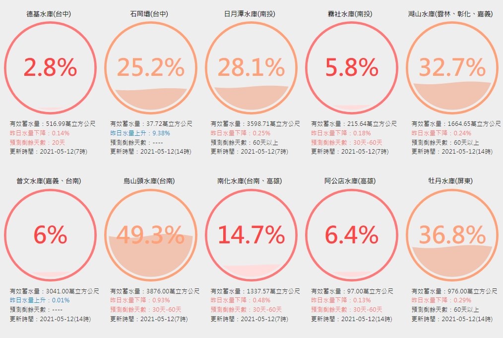 2021年05月14日旱象嚴峻,德基水庫的蓄水率於12日跌破3%,創歷史新低。台中市政府表示,將配合中央尋找替代水源,包括新建工地地下水、緊急抗旱水井、伏流水開發、海淡廠等等。5月底完工後,供水系統每天會新增27.8萬噸公共用水~