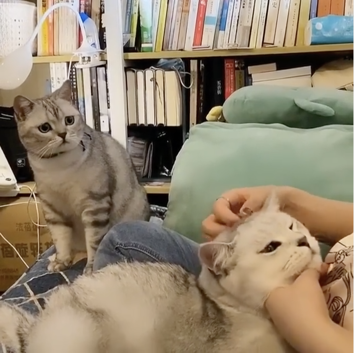 ▼國外就有一則小短片,短短5天就有超過百萬次的觀看次數,影片中的貓咪看了看正在「受寵」的貓咪,再看了看主人,眉頭的上的皺褶都可以畫成三條線了,啊、不對,那本來就是牠的花紋了。QAQ