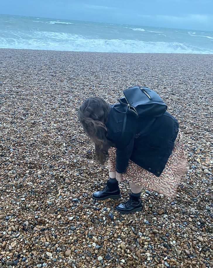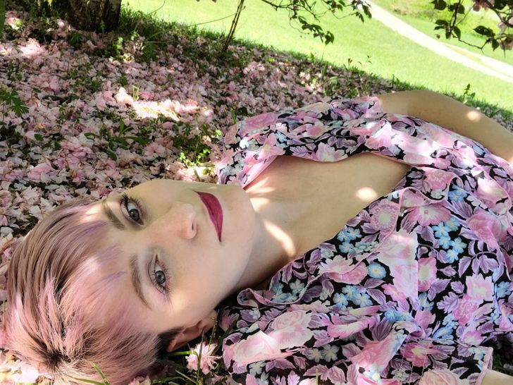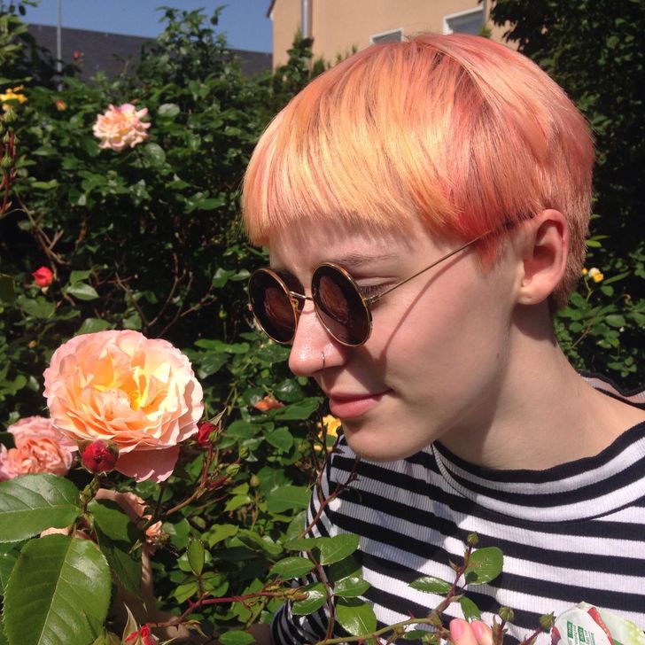 ▼「我褪色的桃紅色頭髮,竟然跟花園裡的花很契合。」