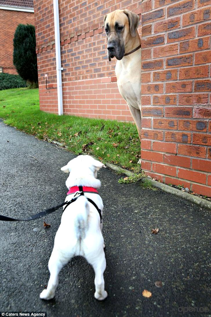 ▼Presley最害怕的東西,就是陌生的狗狗!有一天主人帶Presley外出散步,遇到了一隻可愛的西莎犬。跟Presley相比,那隻狗狗的體型要小很多,但Presley還是很害怕,牠竟然躲到了牆後,等那隻小狗離開後,牠才鬆一口氣從牆角出來。