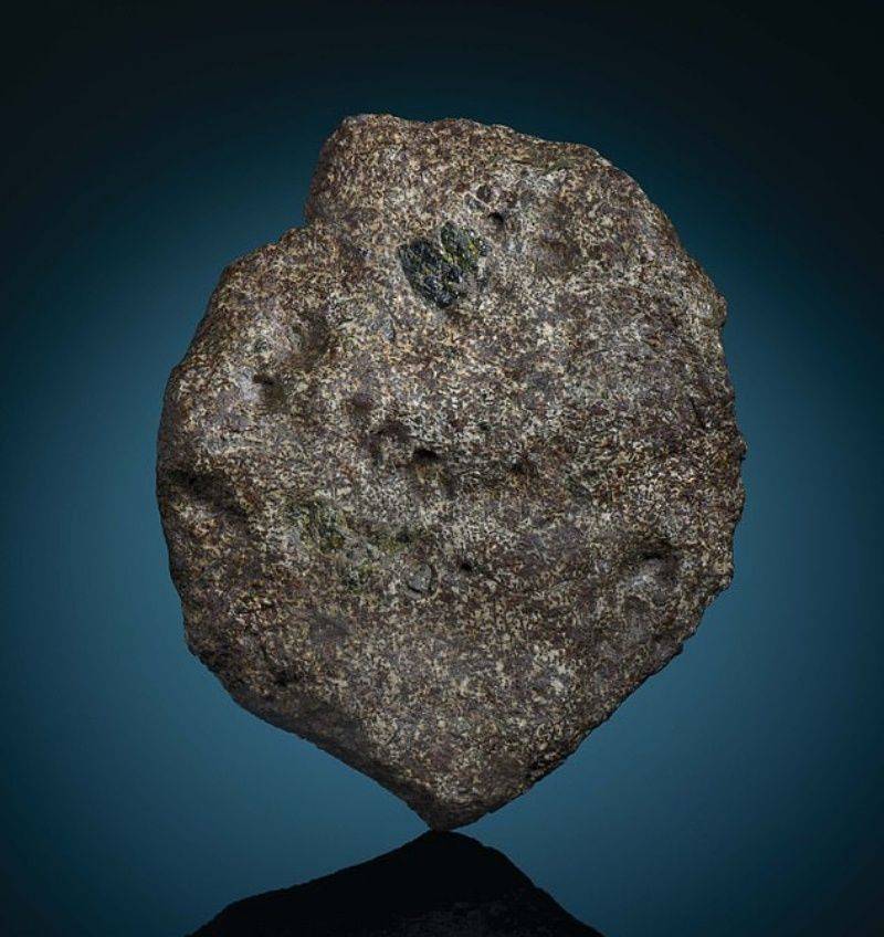 ▼「EC 002」重約70磅,呈棕褐色,表面佈滿大小不一的黃綠色斑點。研究團隊稱,它曾經是液態岩漿,經過10萬年的時間才冷卻、凝固,變成隕石,最終掉在地球上。科學家並沒有發現類似性質的小行星,這代表著「EC 002」的原行星已經變成較大行星的一部分,或者被撞爛成碎片了。
