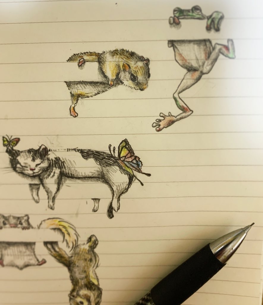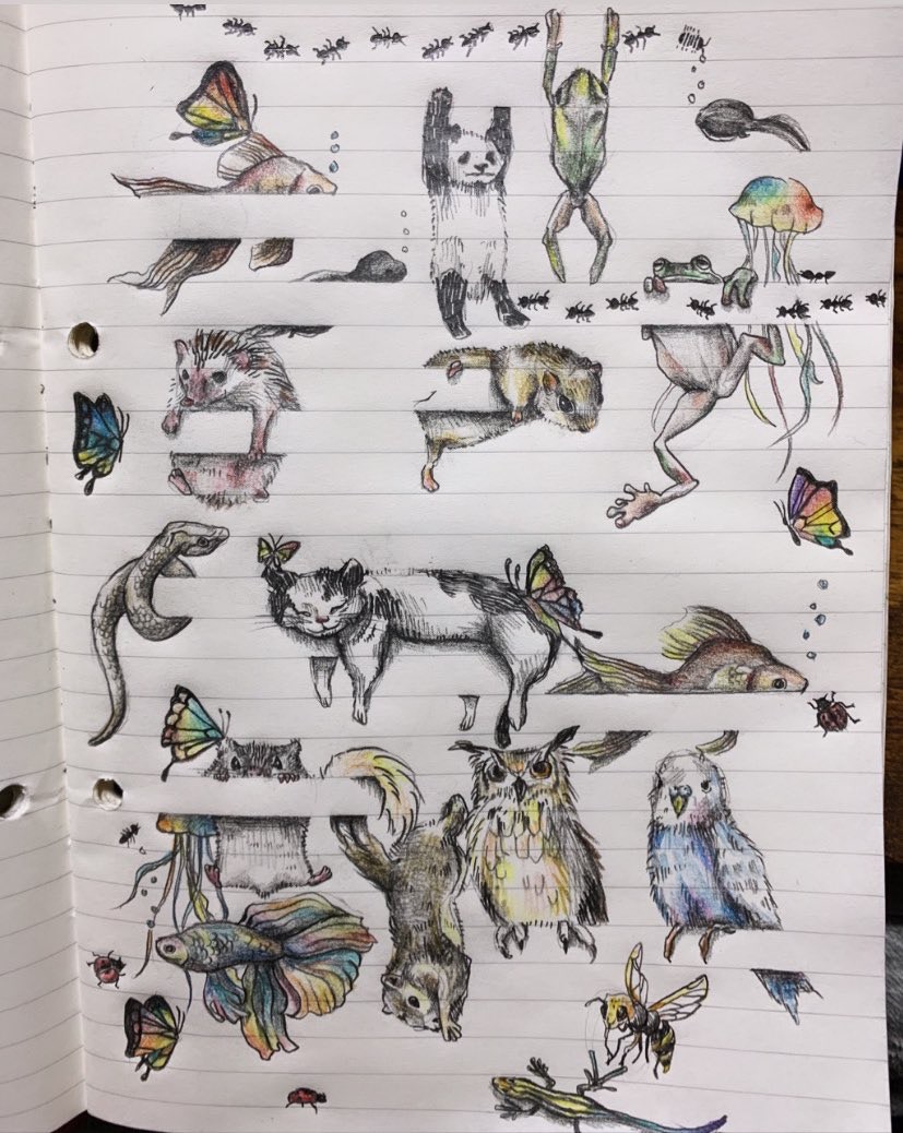▼推主在筆記本上畫畫,把橫線變成動物們攀爬的梯子,或休憩的設施。