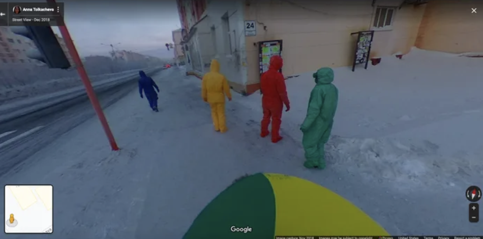 2021年05月24日Google地圖經常拍到有趣的畫面,透過街景服務,說不定能找到趣味景象。最近一組街景截圖就在網路上引發熱議。只見俄羅斯的一片冰天雪地中,4人分別身穿紫色、綠色、黃色和紅色的衣服,還戴著同色的口罩,走在空曠的街道上。他們的模樣讓人想到可愛的「天線寶寶」!