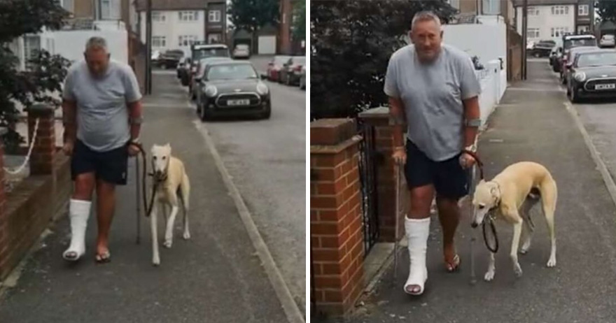 2021年06月17日英國飼主Michelle和老公Russell Jones養了一隻狗狗Bill。不久前Russell意外骨折,腳上打著石膏,走路一跛一跛的,需要靠拐杖支撐。沒想到幾天後Bill走路也開始跛腳了。Michelle看到後非常擔心:「Bill平時喜歡跑來跑去,玩鬧嬉戲,突然走路變成這樣,我們都很擔心。」