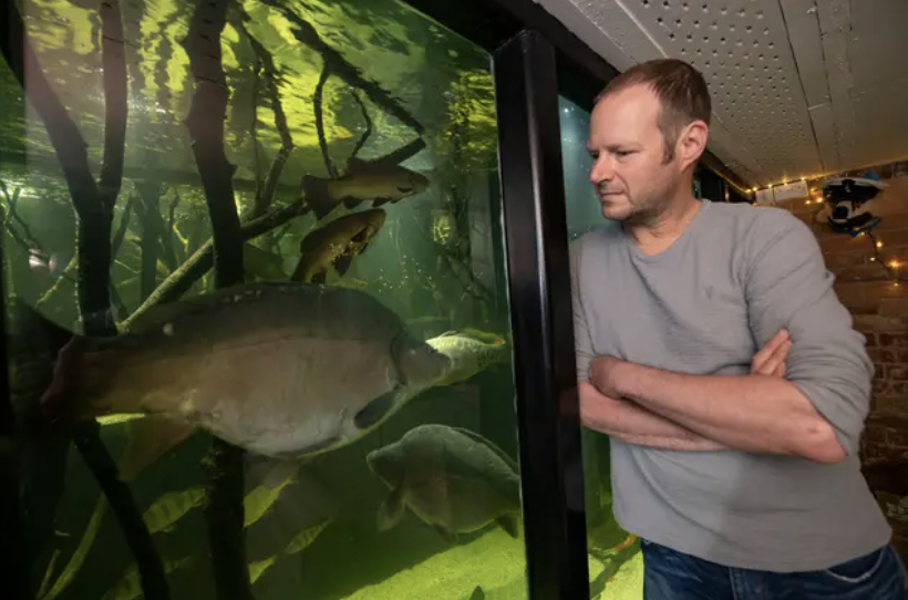 ▼Jack利用地下室的3面牆壁,再加上一面落地玻璃,建造了一座4公尺長、3.6公尺寬、2公尺深的水族館,裡面養著各種各樣的魚類。這些魚都是他自己從運河裡釣上來的。除了地下室的巨大水族箱,他家中還有2個小一點的水族箱,客廳、走廊裡也都是。