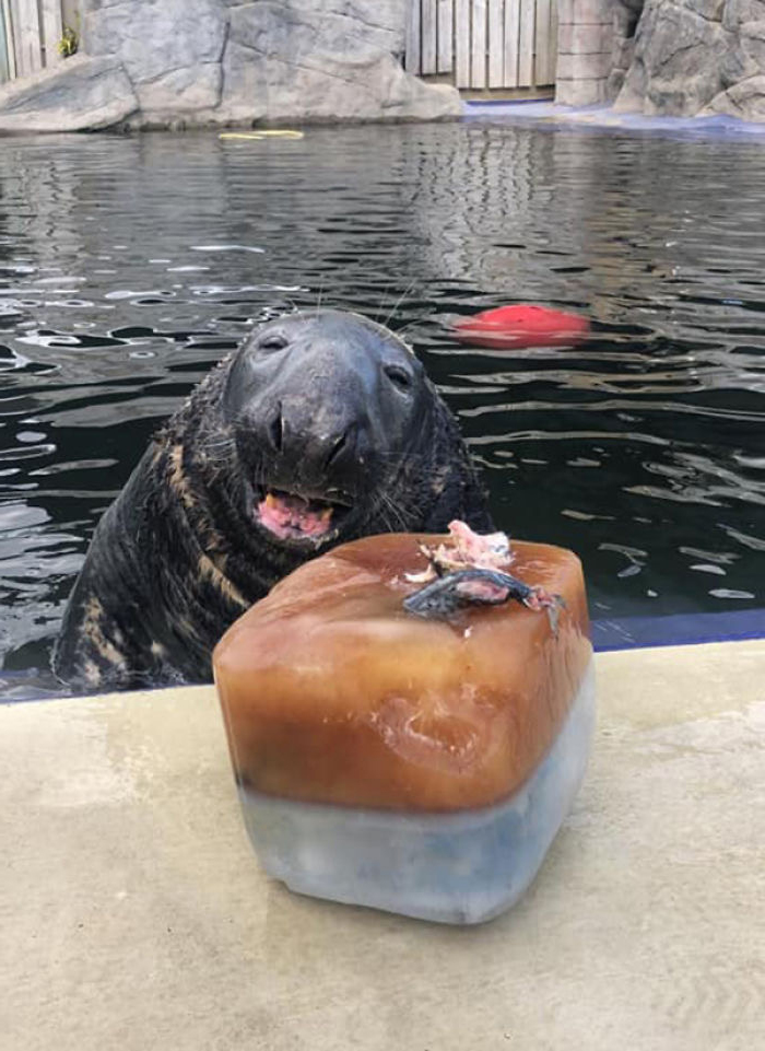 ▼Yulelogs是非常長壽的海豹,為了給牠慶生,管理員送給他一塊魚魚蛋糕,冰塊裡面藏滿了牠最愛吃的魚。收到禮物的Yulelogs開心地瞇起眼睛、露出笑容,看起來萌萌的。