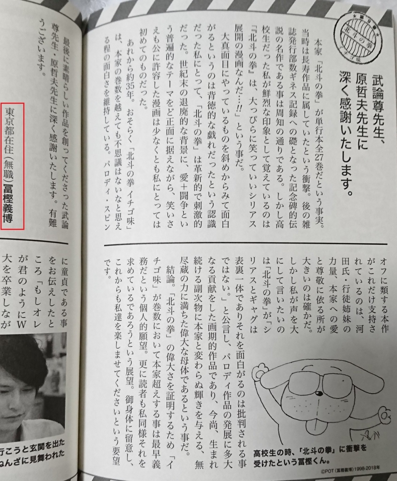 ▼最近冨樫義博撰寫了一篇文字評論,表達自己對經典漫畫《北斗神拳》的尊敬和熱愛。一些眼尖的網友發現,他竟然將自己署名為「無職」,說自己只是一個住在東京都的無業人士,不再是漫畫家。一時之間,「冨樫義博 無業人士」成為了網友們討論的話題。