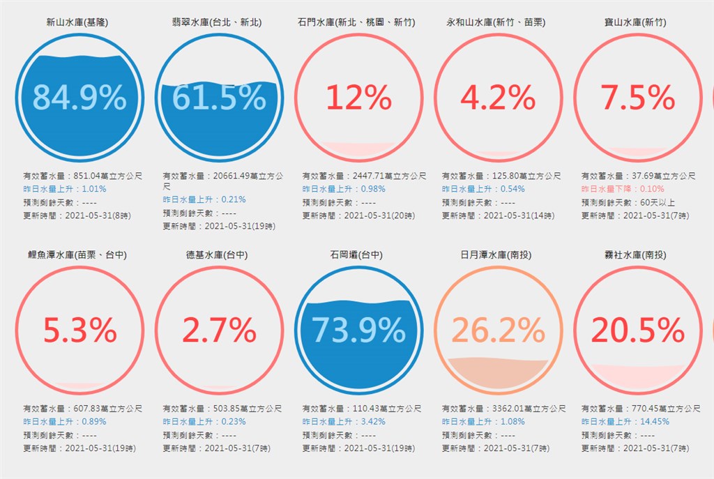 2021年06月01日梅雨滯留鋒面終於到來,全台水庫有不少雨量挹注。截至31日下午4時為止,預估總降雨效益高達1億910萬噸,算下來可供給全台9天用水。水利署副署長王藝峰指出,這一波降雨對部分水庫水情有幫助,不過也造成沿海地區淹水的情況。現在新竹已經解除限水警報,中部地區供5停2措施也無需延長8小時。