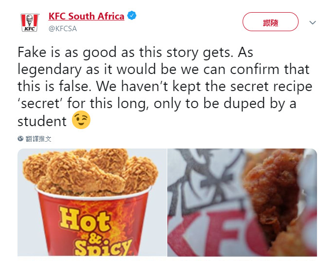 ▼這名男大生態度自然、從容自信,店員並沒有懷疑他,就讓他這樣騙吃騙喝整整1年。消息傳開後,網友們都覺得這名男大生的經歷很傳奇,肯德基南非總公司卻在推特連發數篇推文,澄清真相:「大學生假扮稽查員這麼長時間,如果這件事是真的,那肯定是個傳奇,可惜我們能確認這就是個假新聞。」