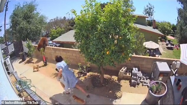 2021年06月02日最近一段超驚險的影片在網路上流傳。從影片中可以看到,一隻成年棕熊帶著2隻幼熊爬入一戶人家的後院。家中的狗狗看到後立刻衝過去吠叫、驅趕。正當棕熊與狗狗對峙時,一名女孩竟衝上前,一把將棕熊推下圍牆,掩護狗狗們撤退回到屋裡!