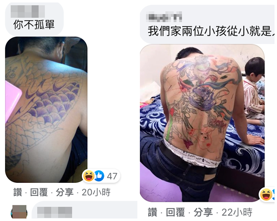 ▼另一位身上有刺青的爸爸看到原po分享的照片,直呼「你不孤單」。其他有類似經歷的網友也po出照片,展示自己的刺青變成孩子著色本的搞笑畫面。