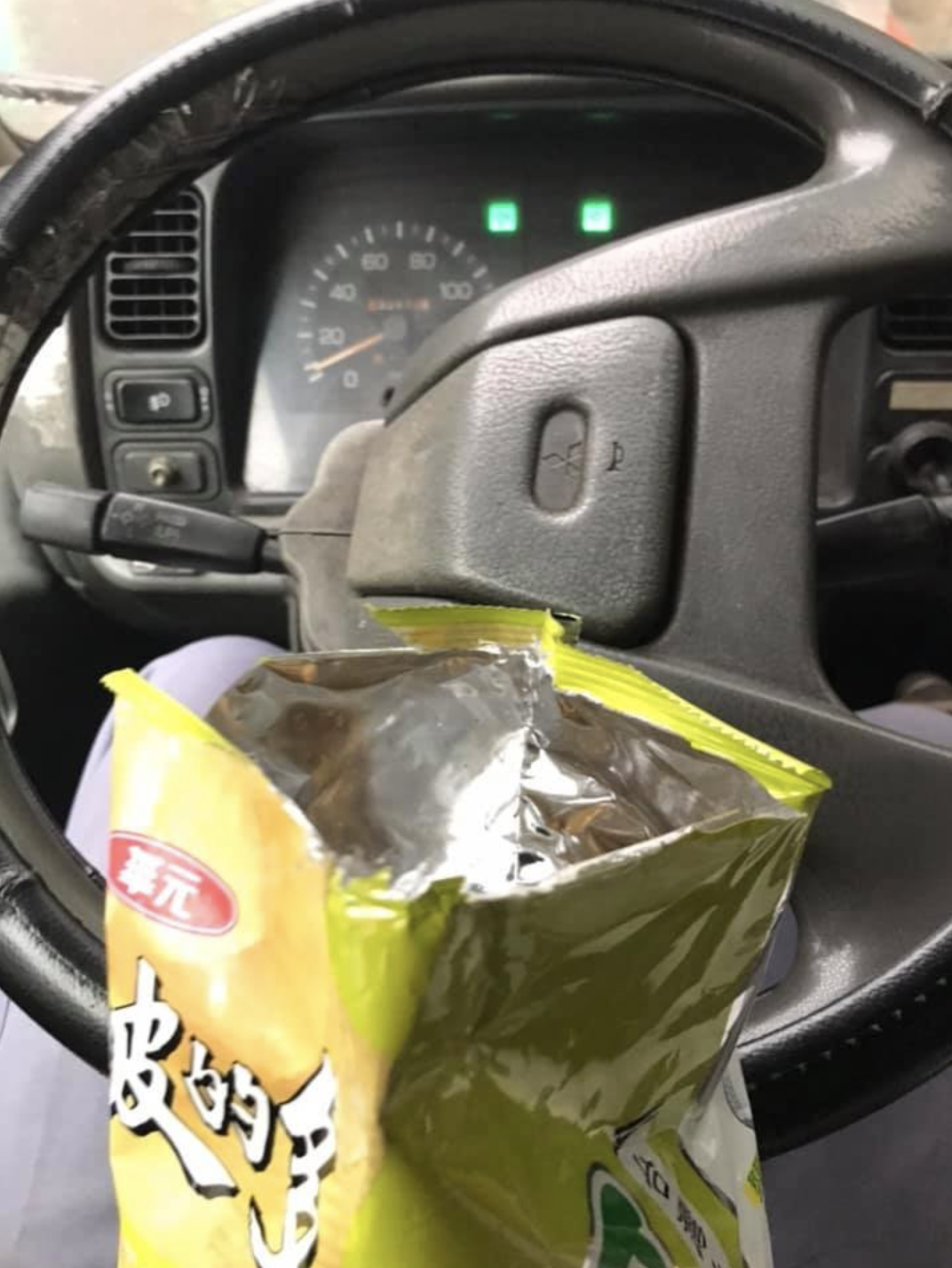 ▼原po表示,因為疫情的影響,民眾網購量大增,這導致近期的貨運量比雙11、過年還要誇張。原po沒空吃飯,只好買了一包洋芋片充飢。他獨自在車裡,剛剛脫下口罩要吃洋芋片,突然有一名婦人敲車窗還拍照,並說:「先生你口罩沒戴好,我要檢舉你!」