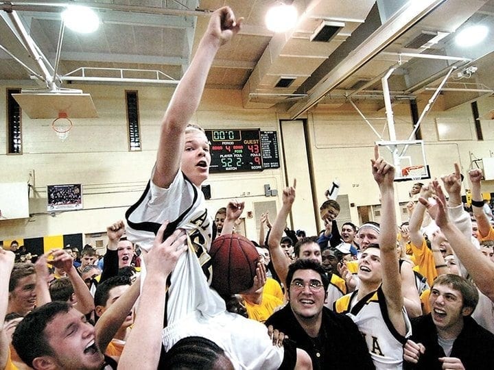 ▼比賽結束,同學們湧入場內為傑森慶祝,隊友們還把他扛在肩上。傑森的故事被上傳到網路上後感動了很多人,1個月後他被總統接見,後來還榮獲ESPY本年度最佳時刻獎。他打敗的是NBA巨星柯比布萊恩,當時柯比布萊恩剛剛完成單場比賽得到81分的壯舉。