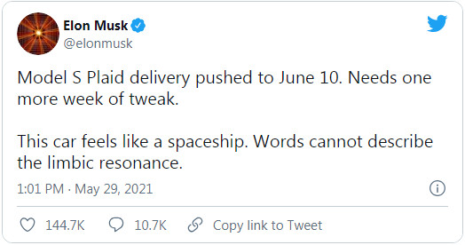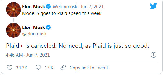 2021年06月16日日前馬斯克(Elon Musk)在推特上宣布,將取消特斯拉Model S Plaid+的生產計畫。Model S Plaid+號稱有1,100匹馬力、837公里高續航力,特斯拉當初的宣傳口號是「品牌動力最強」、「續航力最大」等等。現在這款車還沒有正式交付就夭折,而取消生產的最大原因,是馬斯克認為「不需要了」~