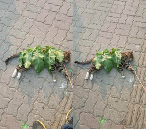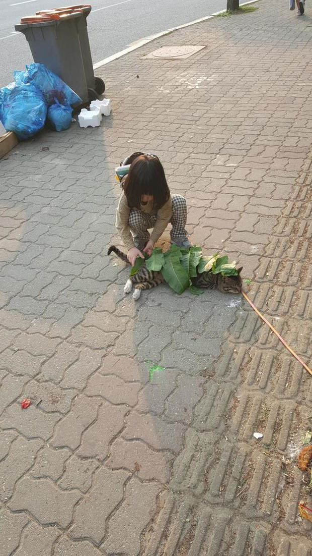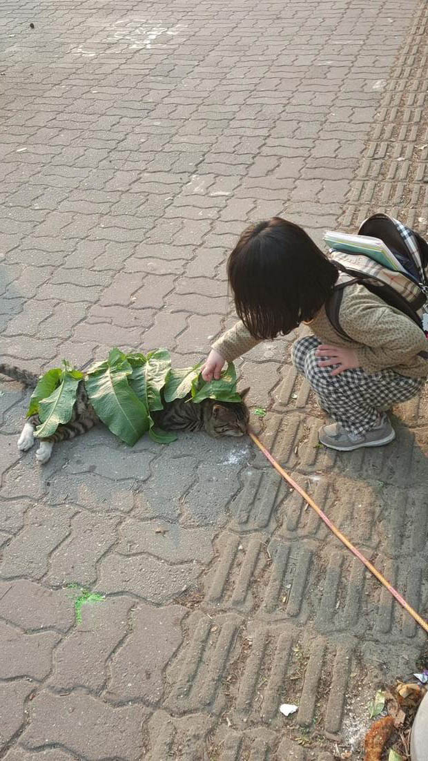 ▼貓咪散步走累了,就側躺在路邊,懶洋洋曬太陽。牠任由暖暖的陽光灑在身上,很快就閉上眼睛進入夢鄉。小女孩路過這裡,看到貓咪躺在地上睡覺,竟然蹲下來將樹葉一片一片蓋在牠身上。小女孩還萌萌地說:「幫牠蓋被子,才不會著涼。」