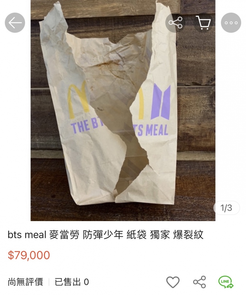 ▼台灣網路上也出現不少「BTS爆裂款紙袋」,不僅外型殘破,還沾有油漬,價格卻很驚人。有人將髒兮兮的紙袋撕裂,標榜「獨家爆裂紋」,標價高達台幣7.9萬元。