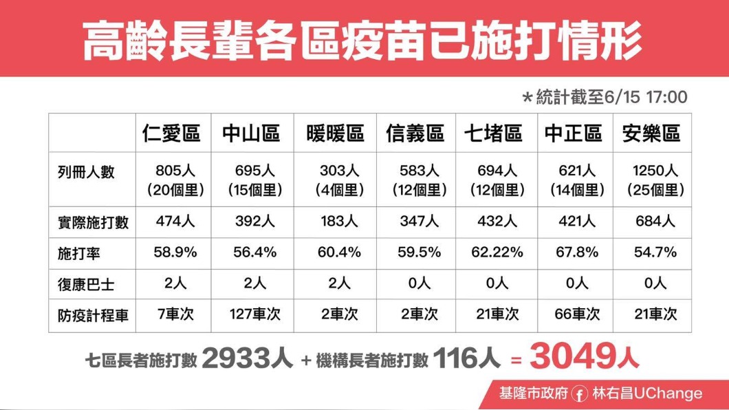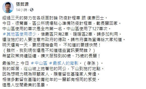 這次基隆市政府開放85歲以上長者施打疫苗,只提到「行動不便者協助安排接駁」,但很多人不知道這項措施,施打現場也沒得停車。張哲源指出,基隆市的各區公所在接種現場有準備防疫計程車,載長輩回家。中山區使用的車次127車次是全市第一,信義區、暖暖區都只2車使用,民眾可以多加利用,長輩接種完疫苗也能安全回家~