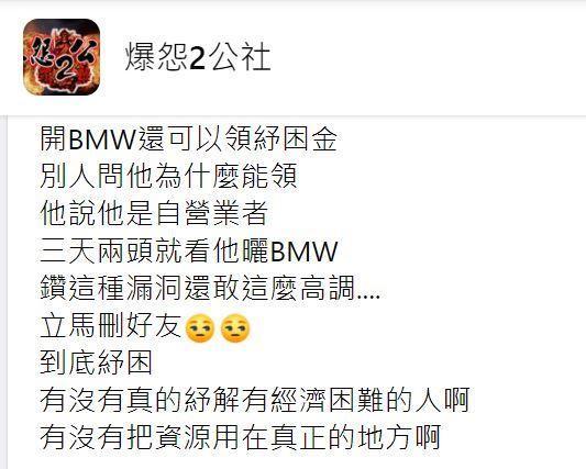 ▼原po認為這名臉書好友開BMW卻爽領紓困金是鑽漏洞,並怒轟:「鑽這種漏洞還敢這麼高調…立馬刪好友。」她同時也質疑:「到底紓困,有沒有真的紓解有經濟困難的人啊?有沒有把資源用在真正的地方啊?」