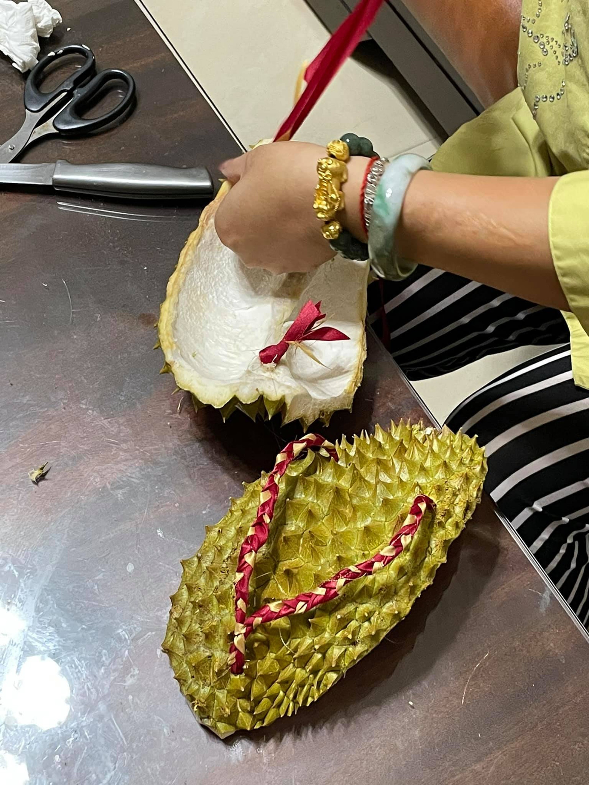 ▼原po分享一組照片,照片中的這雙夾腳拖是用榴槤殼製作的。原po解釋說,老婆因為在家待太久覺得很無聊,因此開始發展獨特的興趣,在榴槤殼上綁紅黃相間的編織繩,製作出一雙特製夾腳拖。「這位大嬸在家真的悶壞了,榴槤皮都可以拿來玩」。