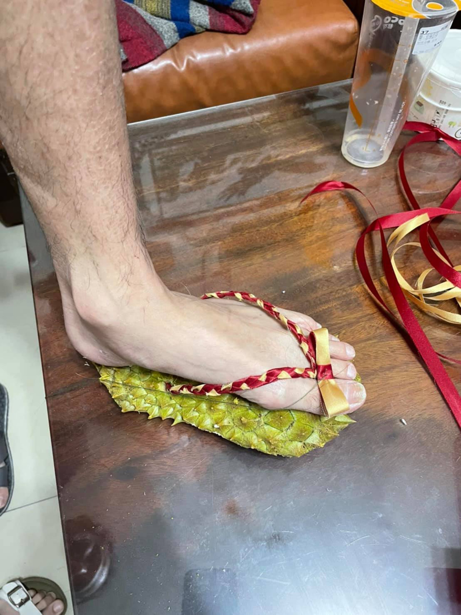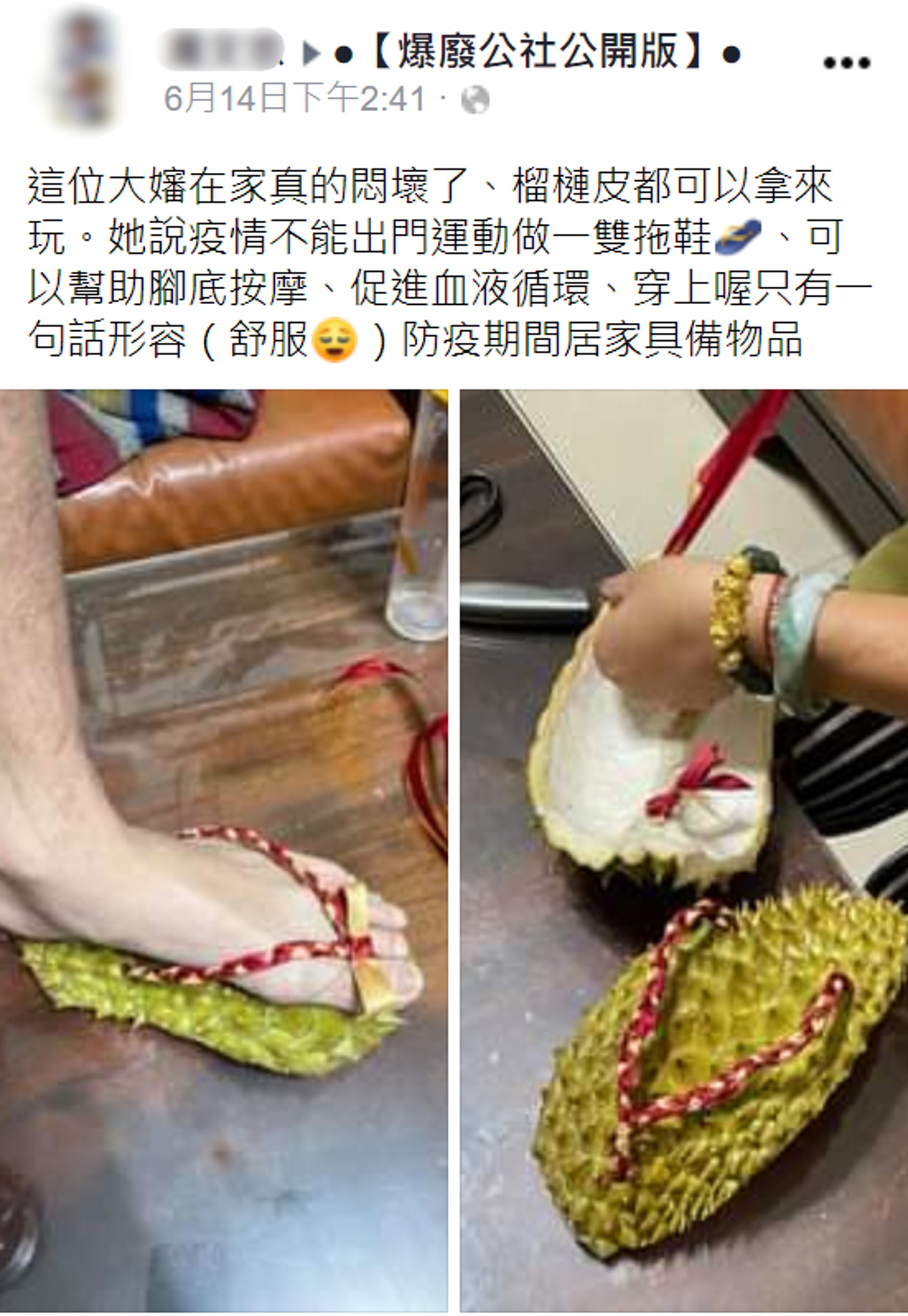2023年06月25日防疫期間,大家待在家中的時間增加,為了排解不能出門遊玩的心情,可謂各顯神通~日前有一名網友在臉書社團「爆廢公社公開版」發文說,由於疫情期間不能到戶外活動,老婆就發揮創意,用榴槤殼製作一雙拖鞋。網友們看到這雙可以「促進血液循環」的拖鞋,忍不住驚呼:「血液循環還是血流如注?!」