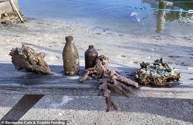 ▼其中有一隻叫Mystique的海豚非常聰明,牠每天都會用喙舉著珊瑚、貝殼等小禮物,送到志工們身邊。這可不是訓練出來的,Mystique完全是自願這樣做的!牠帶來的禮物越來越多,有時會帶10樣禮物,將它們排成一排。