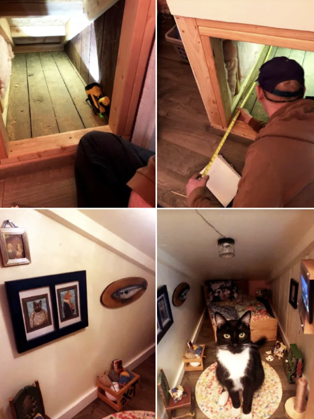 ▼Bryan收拾房間時,留意到樓梯下的一個小空間,正適合改造成貓屋。他拿出尺子測量,以便添置合適的傢俱和擺設。