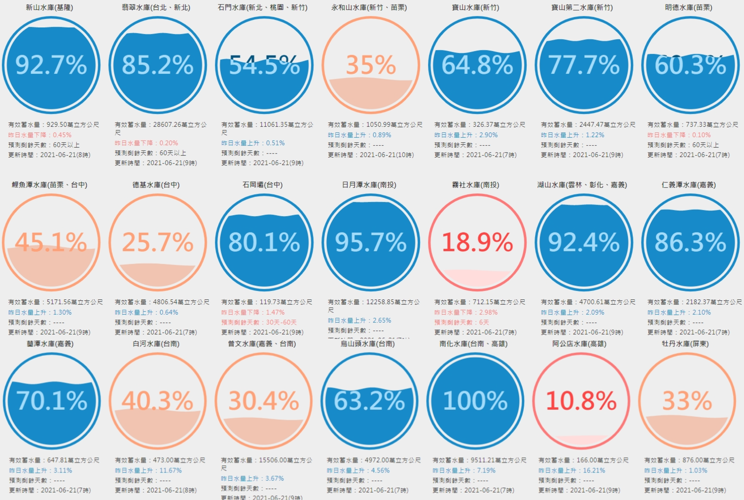 2021年06月22日近日受梅雨鋒面、西南季風影響,台灣中南部遭雨彈襲擊,台南、高雄甚至出現淹水的情形。豪雨讓水庫的蓄水量持續上升,水利署統計,20日單日降雨即可為各地水庫帶來2970萬噸的水。其中曾文水庫和烏山頭水庫進帳最豐,合計約能進帳1850萬噸~