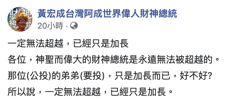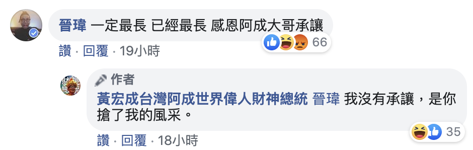 ▼而台灣阿成也在臉書上表達自己最長姓名記錄被超越的心得,而「要投」也特別去回覆阿成的貼文。