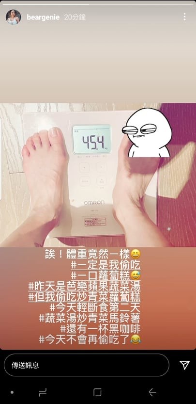 ▼22日這天熊熊站上體重機,沒想到體重依然是45.4公斤。她這才坦言,昨天吃了芭樂、蘋果和蔬菜湯,看似清淡,但可能是因為「偷吃了一口蘿蔔糕」,體重才沒有往下掉。她分享自己的食譜,輕斷食第2天吃了炒青菜和馬鈴薯,還喝了蔬菜湯和黑咖啡。她下定決心:「今天不會再偷吃了!」
