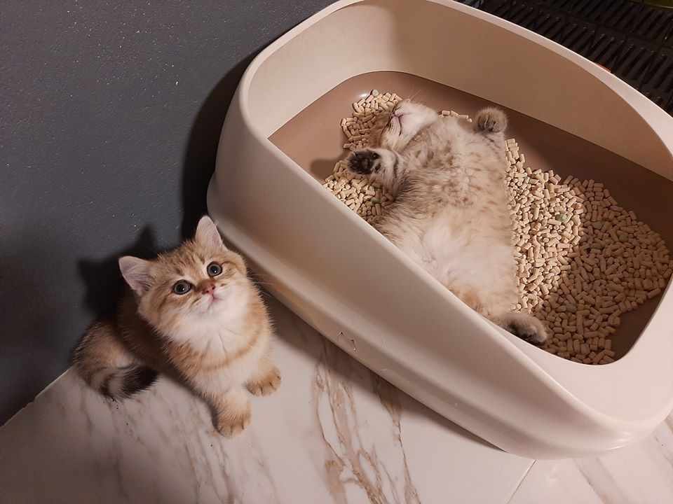 ▼飼主偶然拍到小橘貓霸佔廁所的一幕。牠躺在貓砂上呼呼大睡,另一隻小貓站在旁邊一臉無助,向飼主發射無辜眼神射線求助。