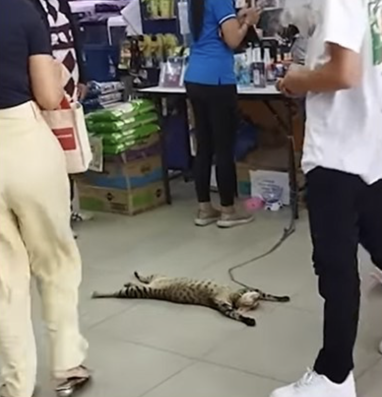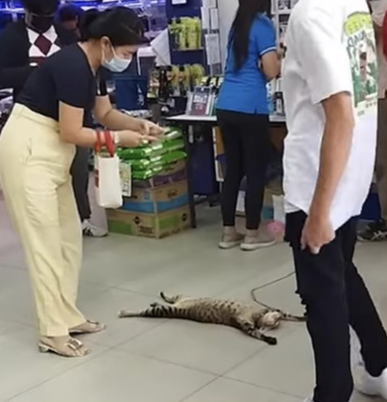 ▼貓咪在超市裡呼呼大睡,豪邁露出肚肚。主人忙著自己的工作,實在顧不上牠。牠也沒有吵其他的客人,只是自顧自躺在地上睡覺,非常乖巧。