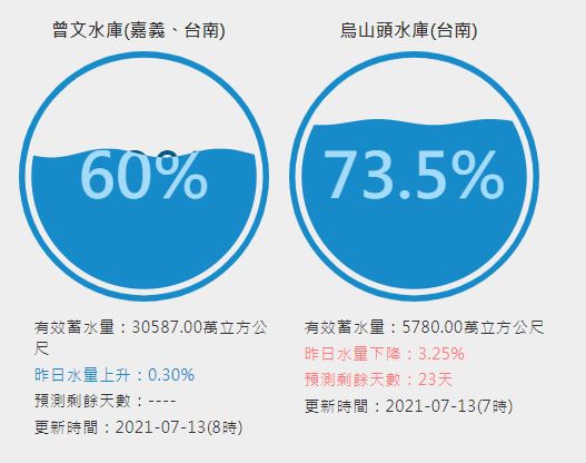 2021年07月14日近期降雨豐沛,全台各地水庫解除「橘色警戒」,蓄水率都突破5成,唯有台中德基水庫的水情依舊吃緊。曾文水庫於7月4日超車翡翠水庫,躍居全台「蓄水量霸主」,在13日早上8點,有效蓄水量達30587萬噸,蓄水率超過6成。接下來上游仍不斷入流,水情持續回穩,穩坐全台蓄水量王座~