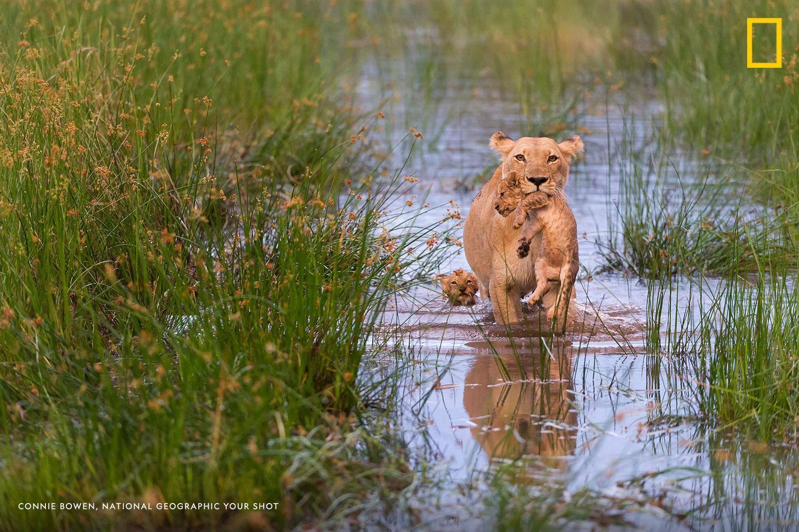 A lioness carries one of her cubs in her mouth while the other swims behind in this moment captured by Your Shot photographer Connie Bowen. pic.twitter.com/U6Nm3m6cZm