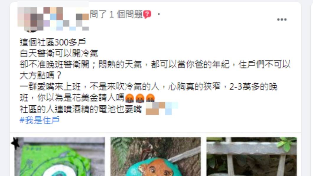 原po表示,自己所居住的社區共有300多戶,但住戶們只允許白班的管理員開冷氣,夜晚管理員卻不行。她覺得這要求很不合理,氣憤說:「悶熱的天氣,都可以當你爸的年紀,住戶們不可以大方點嗎?」