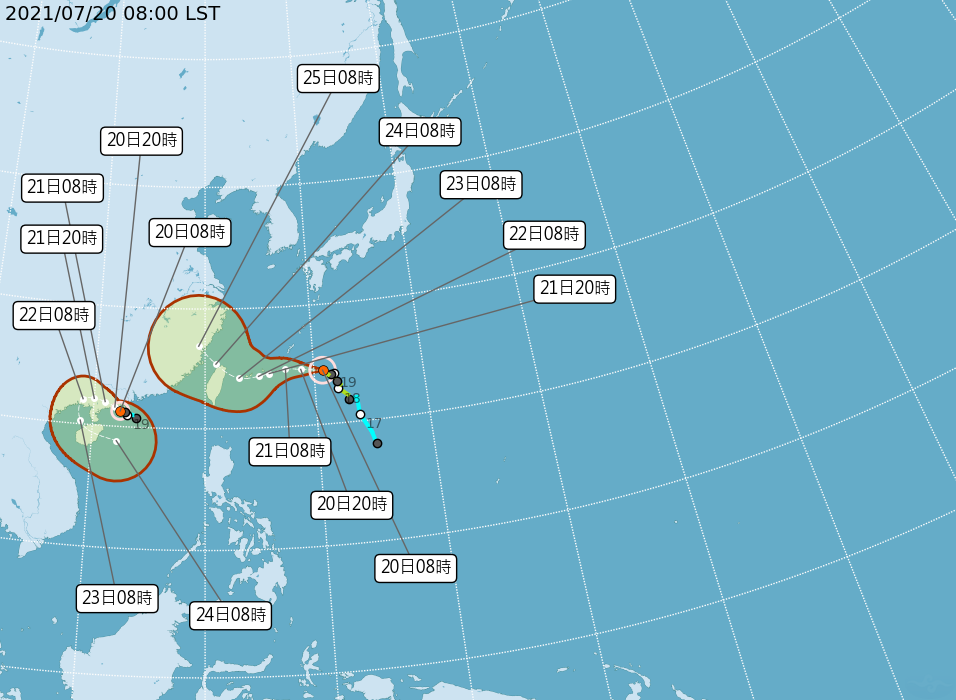 2021年07月20日本週可能會迎來2個颱風。中央氣象局表示,今年第6號颱風「烟花」持續往西緩慢前進,預計週四(22日)逐漸接近台灣北部及東北部海面,週五(23日)、週六(24日)影響台灣。而今年第7號颱風「查帕卡」,今天(20日)早上8時颱風中心位於鵝鑾鼻西方860公里的海面上,預計未來幾天貼近廣東沿海,對台灣短期的天氣沒有直接的影響。