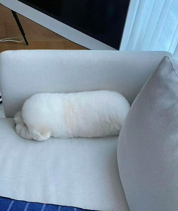 白色小狗「趴沙發」折腳腳酣睡! 渾身超蓬鬆一眼看去「還以為是個抱枕」