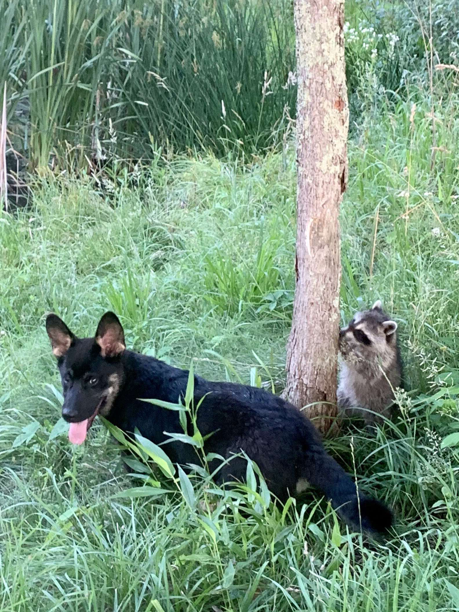同個家出來的!可愛浣熊野放後「還回來找狗勾」 兩個玩不膩:看我躲在哪~
