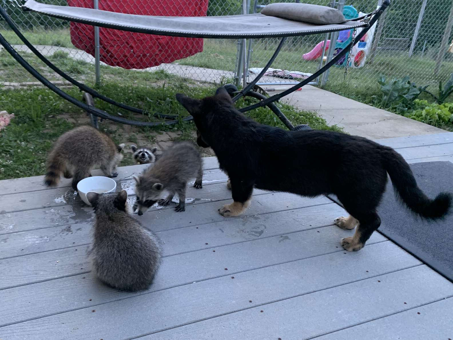 ▼Sarge最喜歡小鹿,Chief則喜歡浣熊。去年時Cheryl救助了3隻孤兒浣熊,等牠們長大能獨自生活,就將牠們放歸野外。浣熊們都適應了野外的環境,但偶爾還會「回家」來探親。其中一隻叫Magnolia的浣熊升格為媽媽後,經常會帶孩子們回來玩。