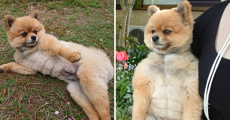 ▼狗狗當然不會有腹肌,推主笑說,先前送Pochi去寵物美容時,Pochi太享受洗澡的過程,竟然躺平睡著了。推主趁這個機會,請美容師幫忙給牠修毛,特別修成了「筋肉博美」的造型。