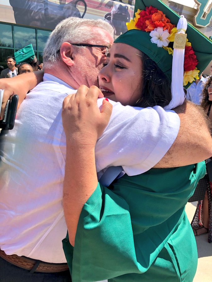 ▼十八年前他抱著剛剛出生的女兒參加畢業典禮,十八年後他抱著女兒出席她的畢業典禮。