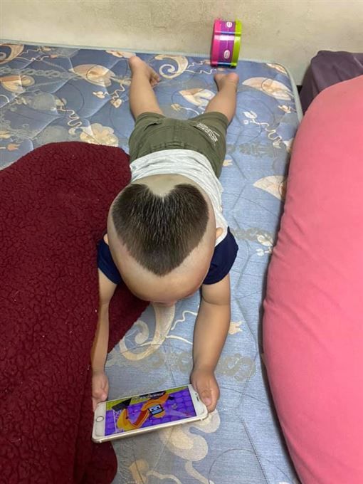 ▼原po表示:「我就知道小孩跟爸爸洗澡洗那麼久肯定沒好事!」從照片中可以看到,小孩的頭髮被剪成了整齊的心型,這顆心非常工整,旁邊的頭髮被全部剃光,看起來怪怪的。