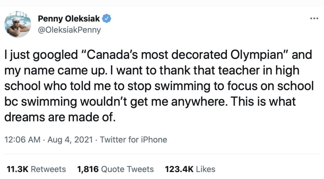 在本屆東京奧運中,21歲的加拿大泳將奧萊西亞克(Penny Oleksiak)游出好成績,總共拿到1銀2銅共3面獎牌。賽後她在推特上向高中老師「道謝」,寫道:「謝謝你當初說我游泳沒前途,但我的現在正是夢想打造的。」