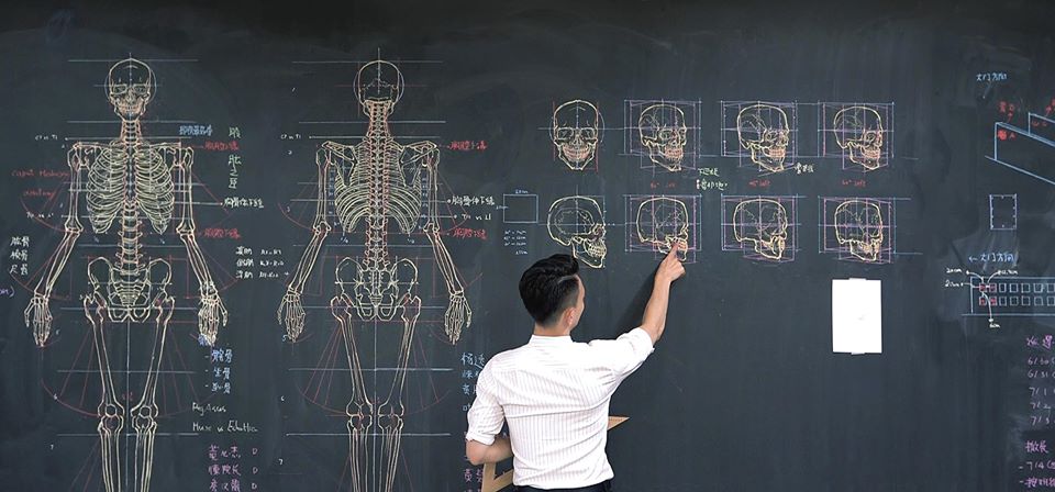 ▼鍾全斌不只傳授設計課,他精準的構圖也受到醫學院青睞。原本和醫學沒有交集的他,因為在手繪骨骼圖在網上傳播,應聘為廈門醫學院老師,特別傳授醫學生繪製「人體形態素描」,解構骨骼、肌肉和內臟的位置。